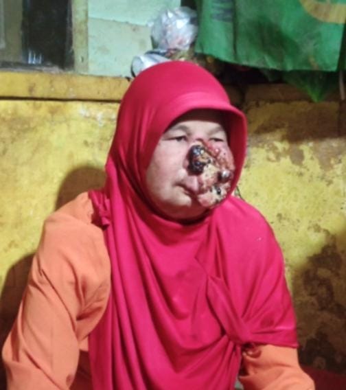Penderita penyakit tumor ganas diwajah Emma Sari Siregar (56) warga Desa Pargarutan Tonga, Kecamatan Angkola Timur, Kabupaten Tapanuli Selatan, Sumatera Utara, akhirnya dirujuk ke Rumah Sakit Umum (RSUD) Sipirok, Senin (10/7/2023).