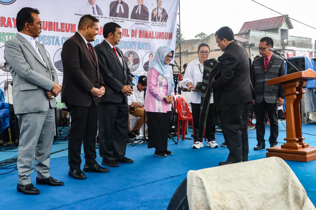 Walaupun hujan turun cukup deras, Wali Kota Pematang Siantar dr Susanti Dewayani SpA tetap antusias menghadiri acara Jubileum 120 Tahun Injil di Simalungun GKPS Distrik 1 dan Pesta Olob-olob GKPS Resort Raya, di Gereja Kristen Protestan Simalungun (GKPS) Pematang Raya 1903, Kecamatan Raya, Kabupaten Simalungun, Sabtu (02/09/2023) sore.