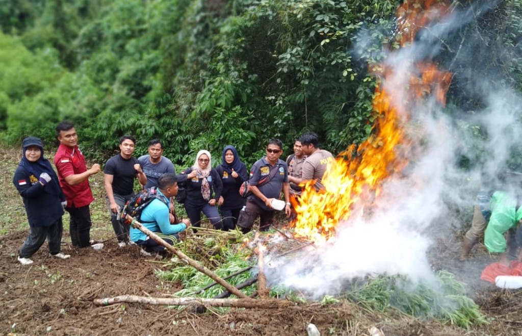 Badan Narkotika Nasional (BNN) Kabupaten Mandailing Natal (Madina), Provinsi Sumatra Utara kembali menemukan dan memusnahkan kebun ganja di perbukitan Tor Sihite, Senin (5/9/2023). Kali ini berlokasi di Kecamatan Tambangan.
