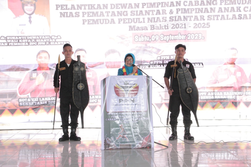 Wali Kota Pematang Siantar dr Susanti Dewayani SpA bersama sejumlah unsur Forkopimda disambut hangat saat menghadiri pelantikan Dewan Pimpinan Cabang Pemuda Peduli Nias (PPN) Kota Pematang Siantar dan Pimpinan Anak Cabang (PAC) PPN Kecamatan Siantar Sitalasari di Gedung Mora, Jalan Sisingamangaraja No 339, Sabtu (09/09/2023). Bersama sejumlah unsur Forkopimda, dr Susanti menerima pengalungan bunga dan disambut dengan Tari Moyo.