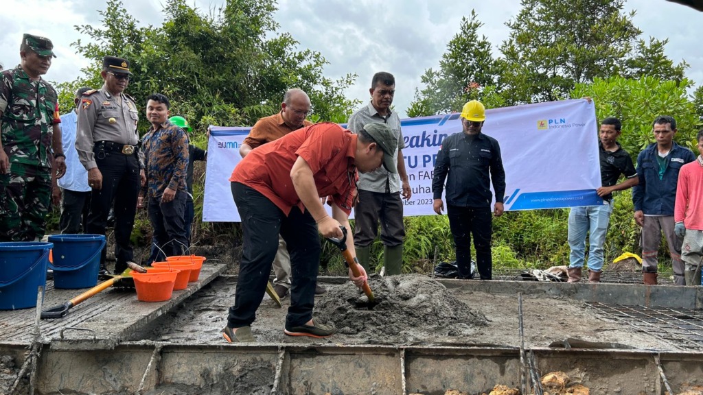 Pj Bupati Tapteng, Elfin Elyas Nainggolan lakukan Groundbreaking perbaikan jalan Labuhan Angin bersama Manager PT PLN Indonesia Power Labuhan Angin PGU, Berlison Haloho.