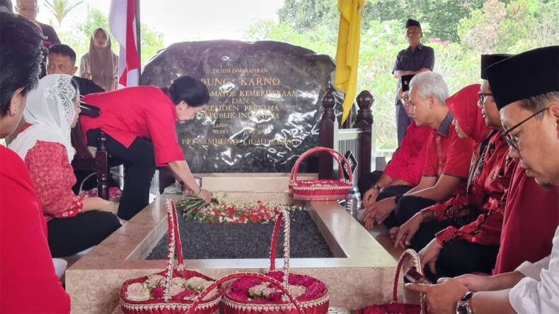 MASYARAKAT Blitar Raya begitu antusias menyambut kedatangan Ketua Umum PDI Perjuangan Megawati Soekarnoputri bersama dengan calon presiden (capres) Ganjar Pranowo dan calon wakil presiden (cawapres) Mahfud MD saat melakukan ziarah makam Presiden pertama RI Soekarno, pada Jumat (3/11).
