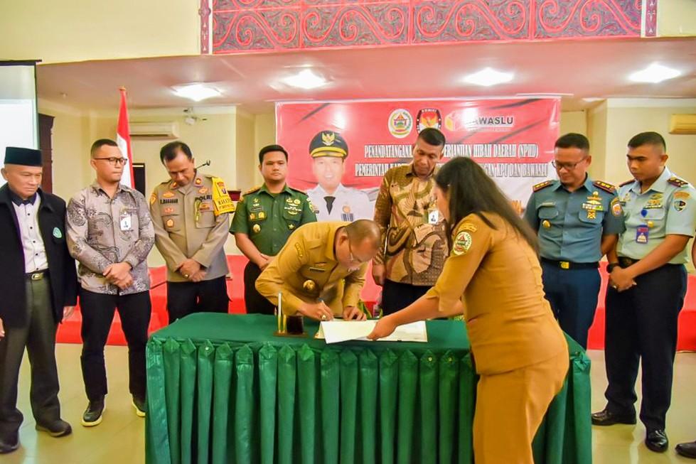 Pj Bupati Tapanuli Tengah Sugeng Riyanta, menandatangani Naskah Perjanjian Hibah Daerah (NPHD) Pemkab Tapanuli Tengah dengan KPU dan Bawaslu terkait Dana Hibah Pemilihan Kepala Daerah Serentak Tahun 2024 Kabupaten Tapanuli Tengah, yang digelar di PIA Hotel Pandan, Senin (27/11/2023).