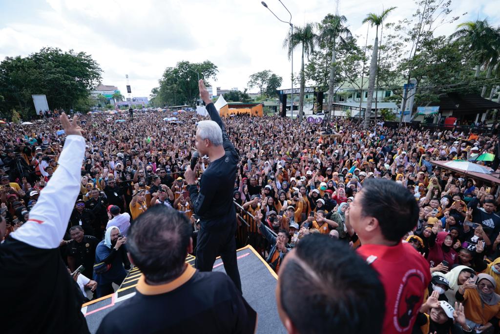 ALUN-alun Kapuas Pontianak mendadak penuh dengan lautan manusia, pada Minggu (25/11). Puluhan ribu masyarakat berdesakan mengikuti senam sehat yang digelar Partai Hanura. Kehadiran capres cawapres 2024, Ganjar Pranowo dan Mahfud MD menjadi alasan kuat masyarakat berjubel di sana.