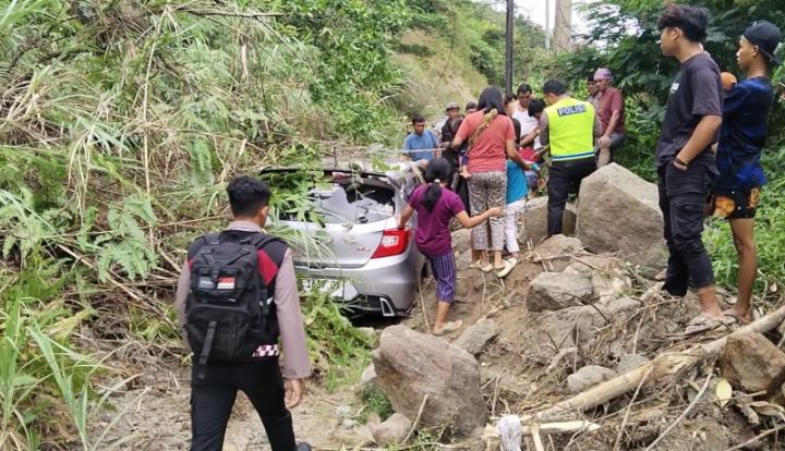 Tanah longsor disertai batu dan pohon tumbang terjadi di Desa Pancur Napitu, Kecamatan Siatas Barita, Kabupaten Taput. 1 unit mobil Honda Brio tertimpa tanah longsor saat sedang melintas menuju arah Sipirok Kabupaten Tapsel, Sumatera Utara.